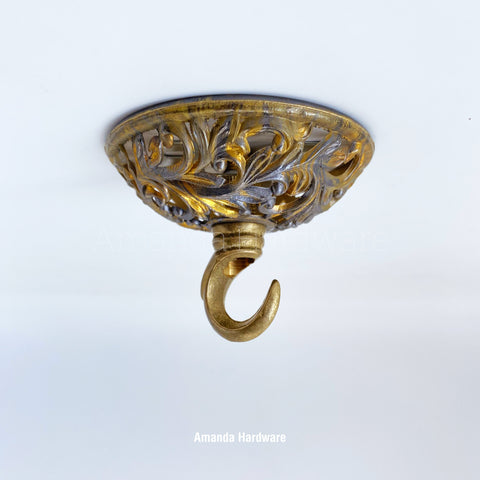 A stunning brass hook with cut-thru floral details that can be used to hang almost anything and will add style and charm to your home. The perfect accessory for home decor hangings on the ceiling and wall. This multi-purpose hook may be used for hanging planters, flower pots, swag hanging pendant lamps, string lights, holiday decorations, wind chimes, sun catchers, bird feeders, lanterns and more! Easy to install with included hardware. The versatile open hook slot will accommodate various sized cords and rings.